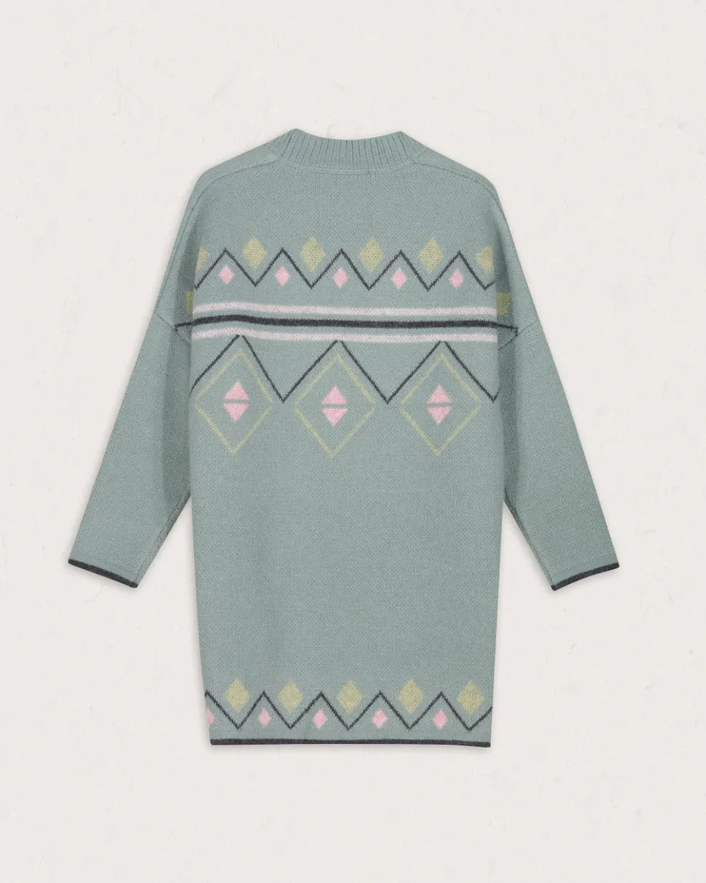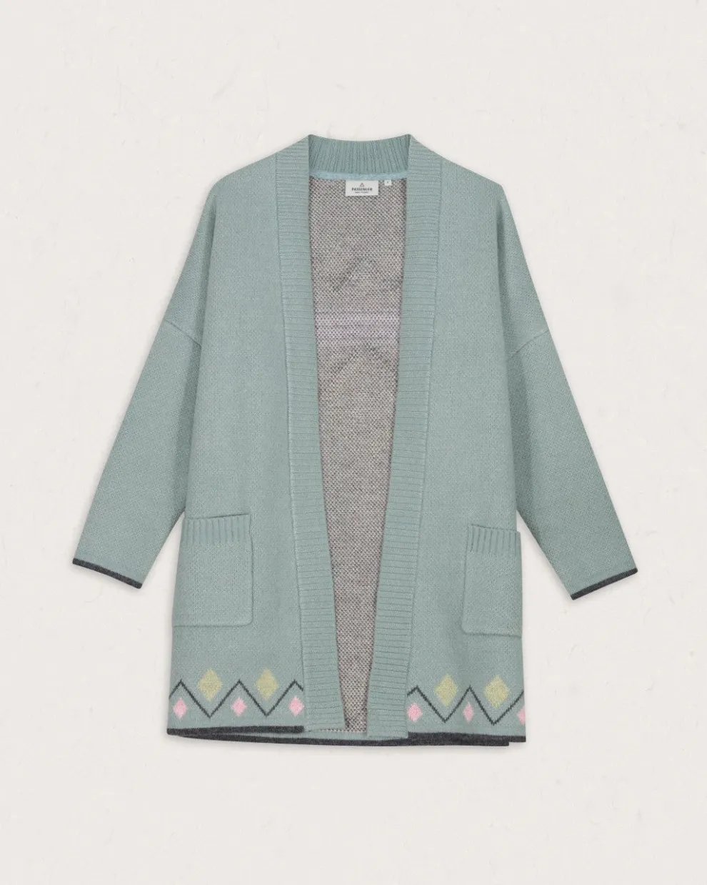 - Mid-weight open front cardigan made in soft recycled yarns with a jacquard knit pattern.