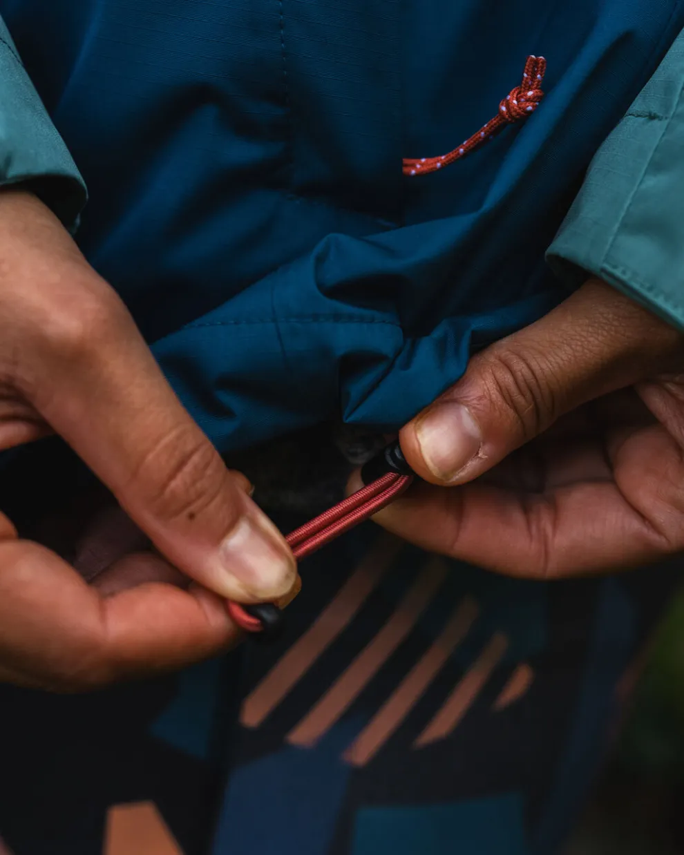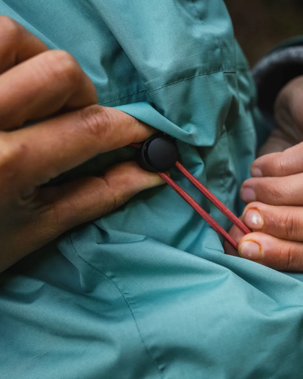 - Water resistant jacket with a zip guard made using laminated recycled polyester.